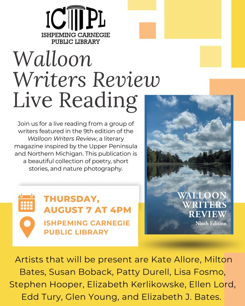 Join us for a fun afternoon at the Ishpeming Carnegie Library! Come and experience the original contributors reading their selections from Walloon Writers Review Ninth Edition and more. We are pleased to announce that Traverse City poet Katherine Roth will be reading with us. Meet the contributors, founder Jennifer Huder and enjoy a display of nature photography from Elizabeth J. Bates, Tom Barrat, and Kate Allore, as well as a few artifacts that accompany Susan Phare Boback’s short story.