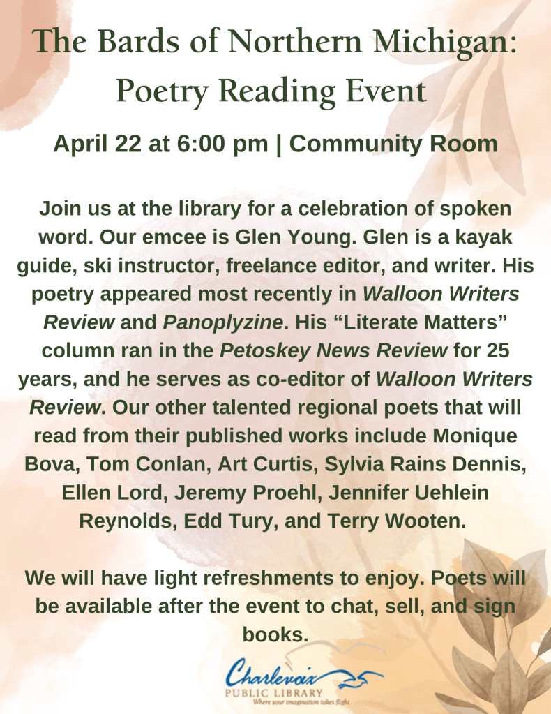 In celebration of National Poetry Month and the richness of regional poetry talent, The Charlevoix Public Library hosts a delightful event, The Bards of Northern Michigan Reading and Workshop! Walloon Writers Review is well represented at this event including Editor Glen Young, Contributor and Host Ellen Lord, and several of our contributors! A poetry workshop featuring Glen Young is also scheduled for April 22nd – follow the link below! This event is free and open to the public Tuesday, April 22nd at 6:00 p.m. Copies of many of the writers books, including Walloon Writers Review Ninth Edition will be available at the event. Check out the flyer for more information. Links are after the flyer.